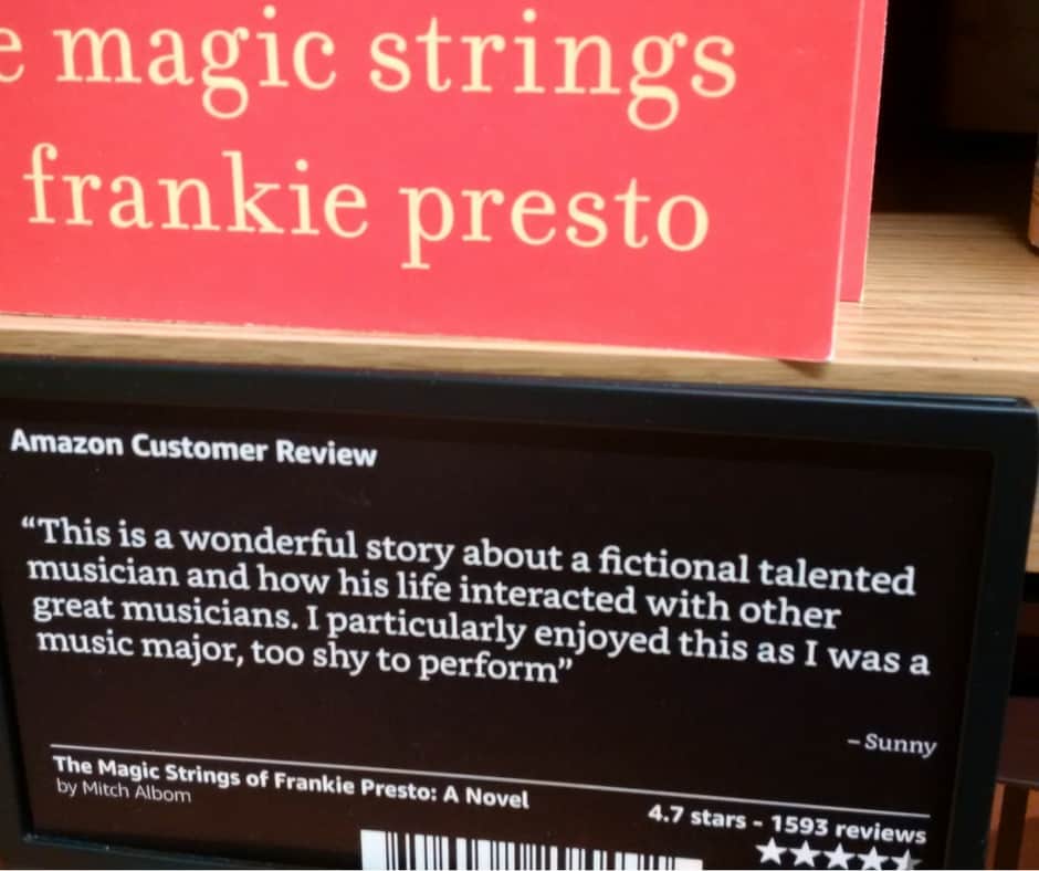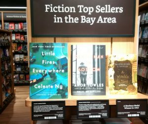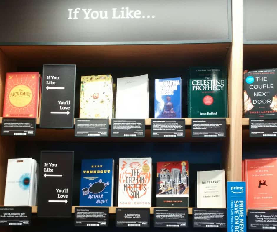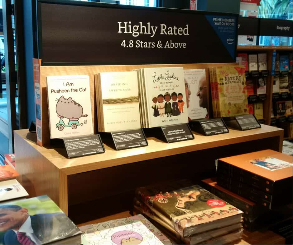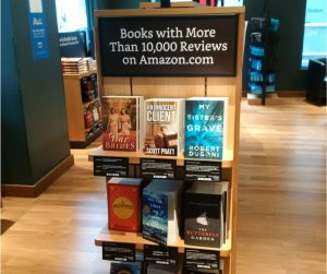 In addition to the shelves arranged by genre, like any bookstore, there are table and end cap displays organized according to Amazon rankings. There are categories such as Books With More than 10,000 Reviews on Amazon.com. Highly Rated 4.8 stars and above. For a bit of regional flavor, there are Fiction Top Sellers in the Bay Area. All data-driven selections based on Amazon’s vast database of most popular books. By the way, a book may have 5 stars, but based on as few as 20 reviews.