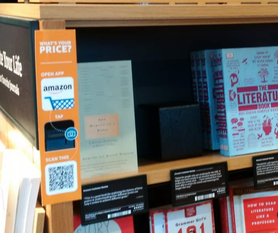 If you’ve got your phone with the Amazon app, you can bring the book to a scanner or take a photo of the bar code on the shelf-talker and you’ll get the prices: the regular Amazon price and the Amazon Prime price. For a more comprehensive write-up of their integrated shopping experience, read this article from The Strategy Group.